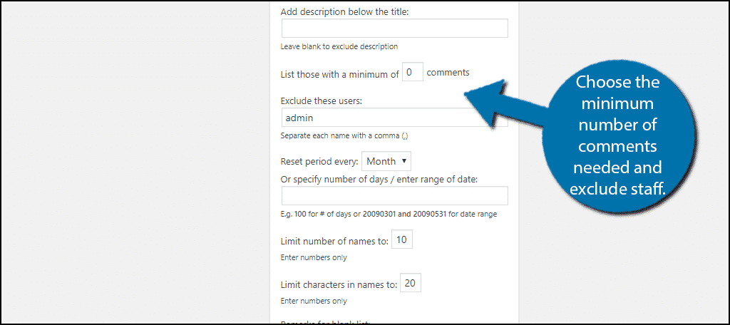 Afterward, you will find the minimum amount of comments needed for the widget to display them. This is highly dependent on the average number of comments each person leaves. You need to pick a number that will display the right people. Underneath this option, you will find a box that allows you to exclude certain groups. By default, the admin is excluded, but you should expand this to include authors and editors. You do not want staff members to be displayed, you want visitors.