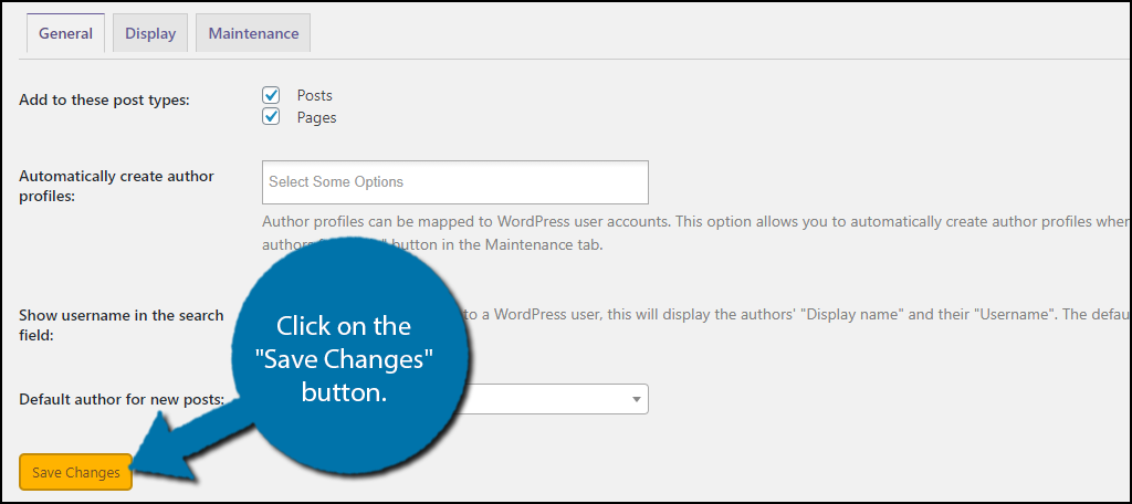 And finally, on the maintenance tab, there is a series of buttons that you can use to make sweeping changes. This is, by far, the most important part of the settings process. You can have the plugin scan your website, locate posts that do not have an author assigned, and fill it in automatically with the “Create missed post authors” button.