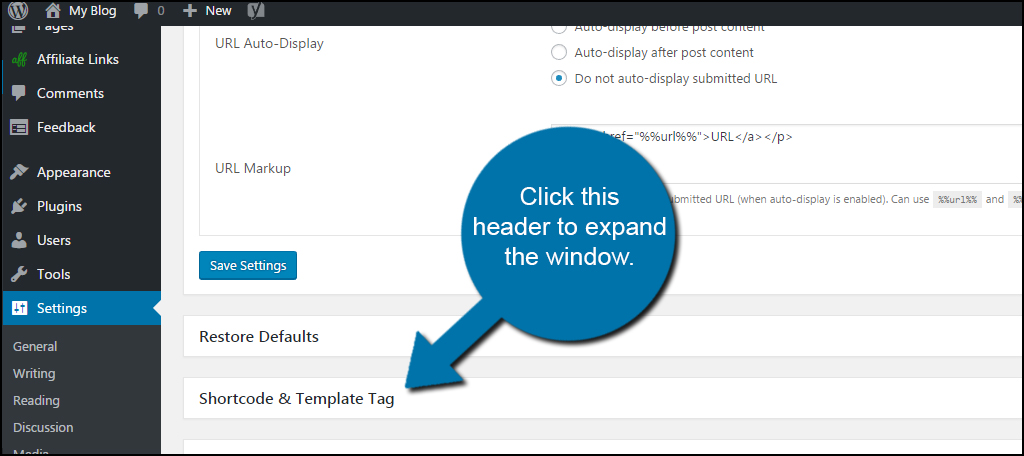 Under the settings options you just saved, you’ll see a section for “Shortcode & Template Tag.” Click this header to expand the window.