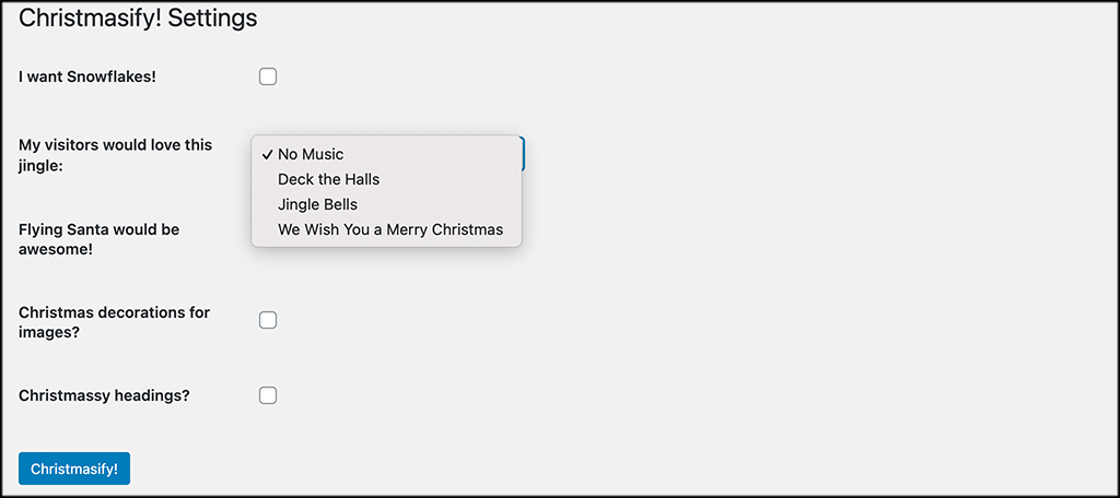 The holidays are upon us. If you are like many others out there, decorations are going up around the house, and the Christmas spirit is in full swing. Why not add a little of that Christmas joy to your website by using a smooth plugin like Christmasify? This plugin will allow you to add all sorts of seasonal fun to your site.