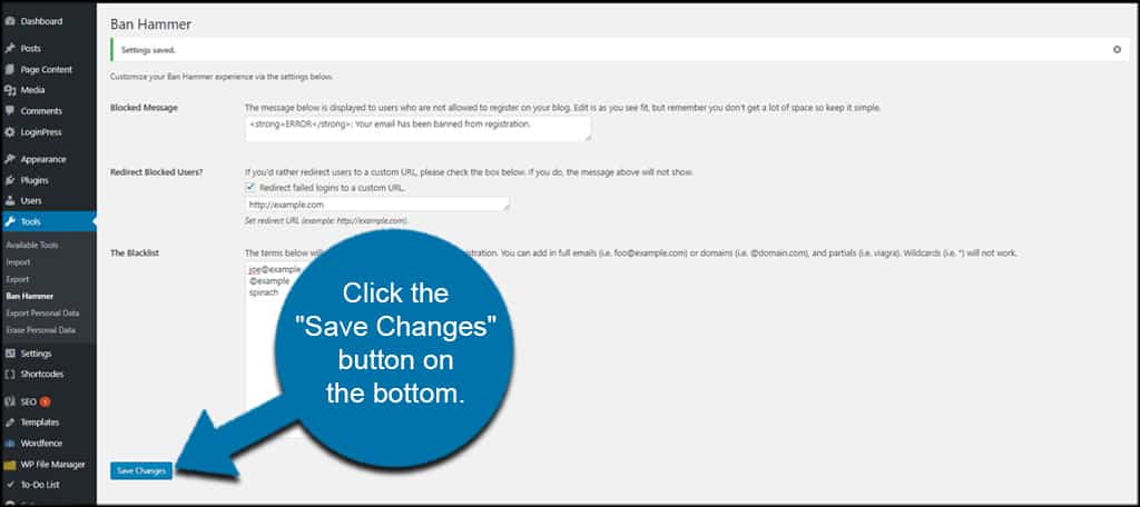 Once you click Save Changes, all of the domains in the blacklist are blocked from registration in WordPress.