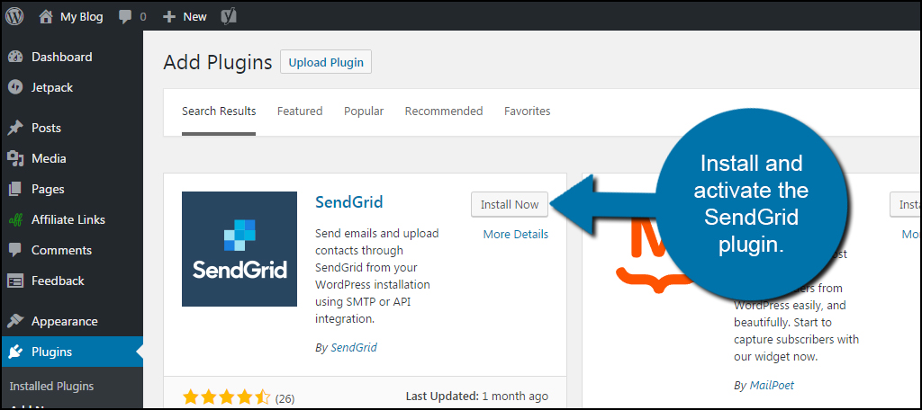 After you finish setting up your account, go back to your WordPress admin dashboard. Install and activate the SendGrid plugin.