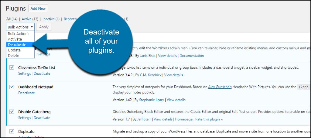 If you’re unable to access the WordPress backend, you can use an FTP program such as Filezilla to change the name of the “plugins” folder in WordPress to “plugins.deactivated.” This will remove the plugins from use on your site.