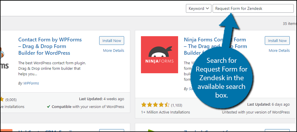 Search for Request Form for Zendesk in the available search box. This will pull up additional plugins that you may find helpful.