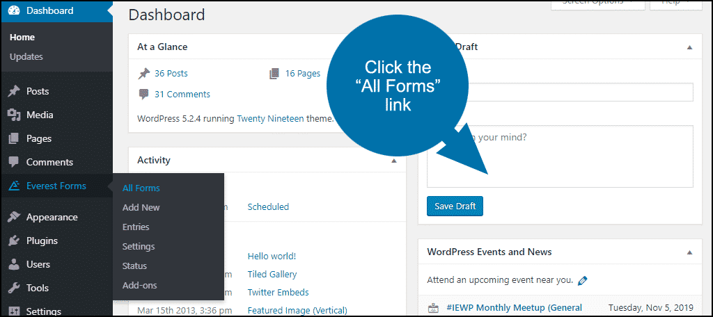 In the left column navigation, mouse over the “Everest Forms” link and click the “All Forms” link.