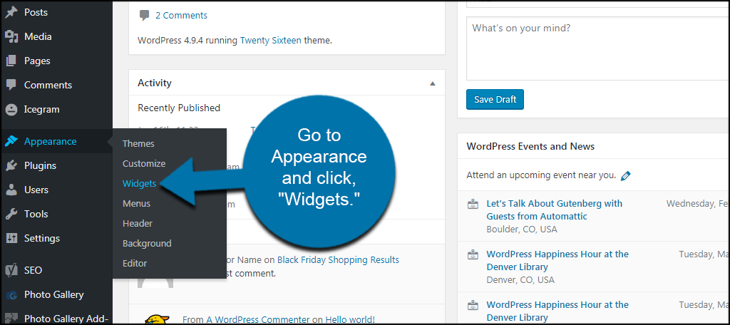 From the WordPress admin screen, go to Appearance and click, “Widgets.”