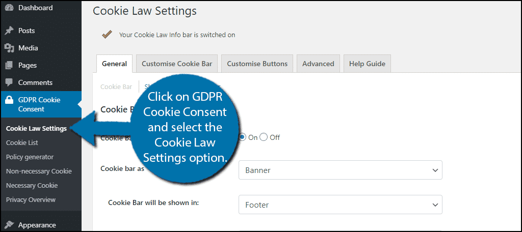 On the left-hand admin panel, click on GDPR Cookie Consent and select the Cookie Law Settings option.