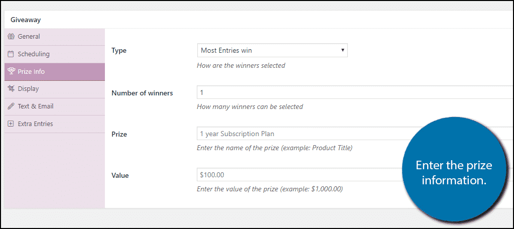 Click on Prize Info. You can select if most entries win or if entering only gives you a better chance, the number of winners, the actual prize item, and how much it is worth.
