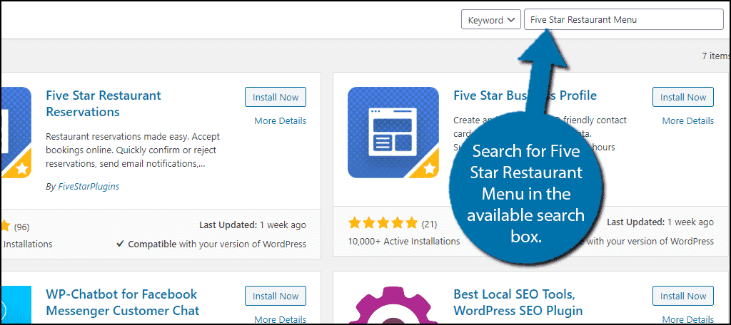 Search for Five Star Restaurant Menu in the available search box. This will pull up additional plugins that you may find helpful.