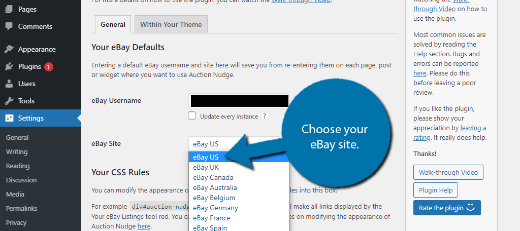 Next, you need to pick which eBay site your username is for. Again, not every eBay site is supported, so if you do not see your country, this plugin is not for you.