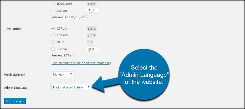 Click, “Save Changes” at the bottom to keep the admin language change.