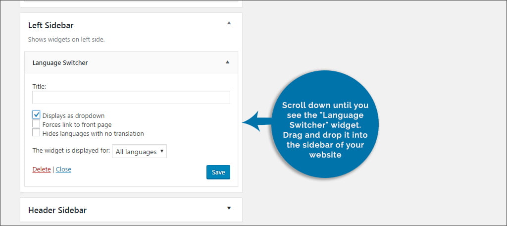 Scroll down until you see the “Language Switcher” widget. Drag and drop it into the sidebar of your website. This gives visitors a way to change the language manually. This widget has a few settings you can change depending on how you want it to appear. For instance, you can check the box to display the switcher as a drop down menu.