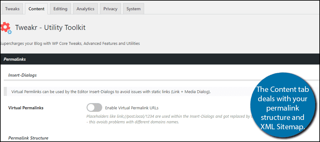 Everything related to the plugin can be adjusted here and it is broken up into 6 tabs. These include Tweaks, Content, Editing, Analytics, Privacy, and System.