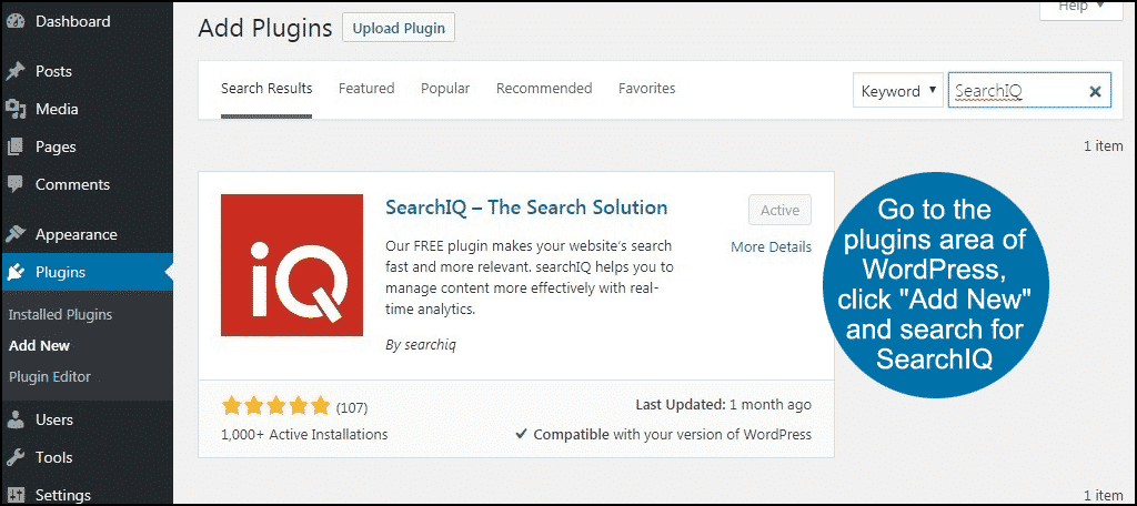 Go to the plugins area of WordPress, click “Add New” and search for searchIQ.