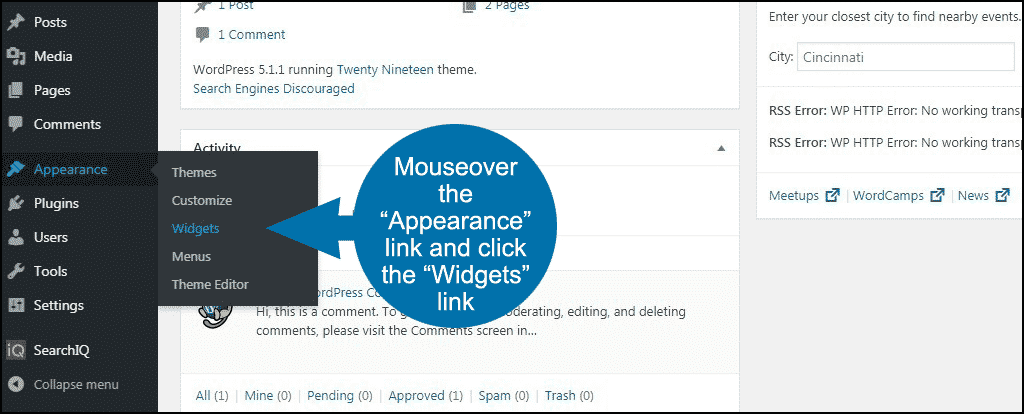 On the left-hand admin panel, click on Appearance and select the Widgets option. The widgets page allows you to customize sidebars, floating footer bars and other widgets on your website.
