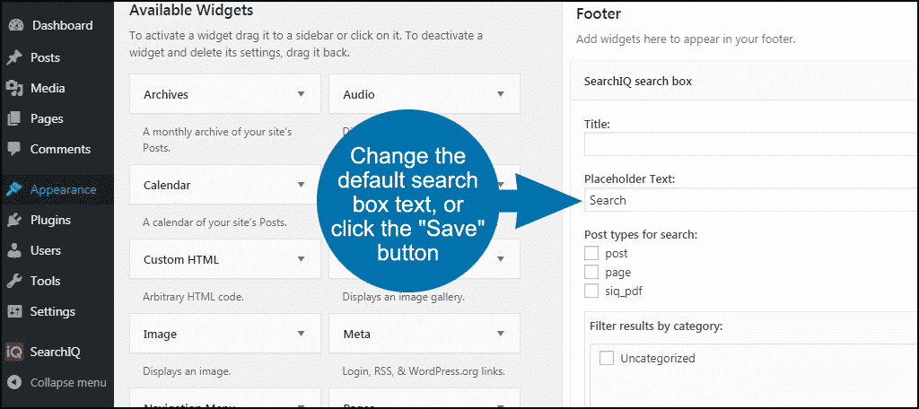 Locate the “searchIQ search box” widget and drag it over to your sidebar.