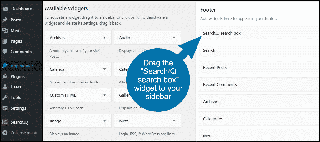 Locate the “searchIQ search box” widget and drag it over to your sidebar.