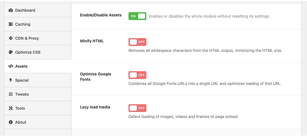 This is a great section, as you can optimize some really cool functions here. Some of the things included are Minify HTML, Optimize Google Fonts, Lazy Load Media, and more. Set these up in the way you want them to run on your site.