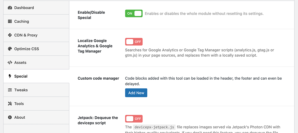 The special tab gives you configuration options for things like Google Tag Manager and Analytics, WooCommerce, and other page speed options.