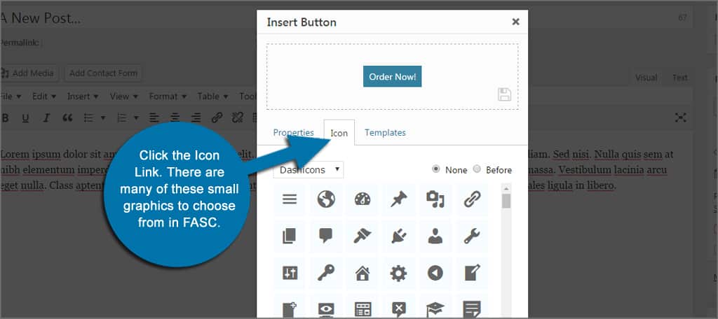 In this example, I created a call to action button in less than a minute. Although this one appears plain, FASC has the ability to help build more attractive designs by choosing the type of graphic you create. This WordPress button plugin comes with: