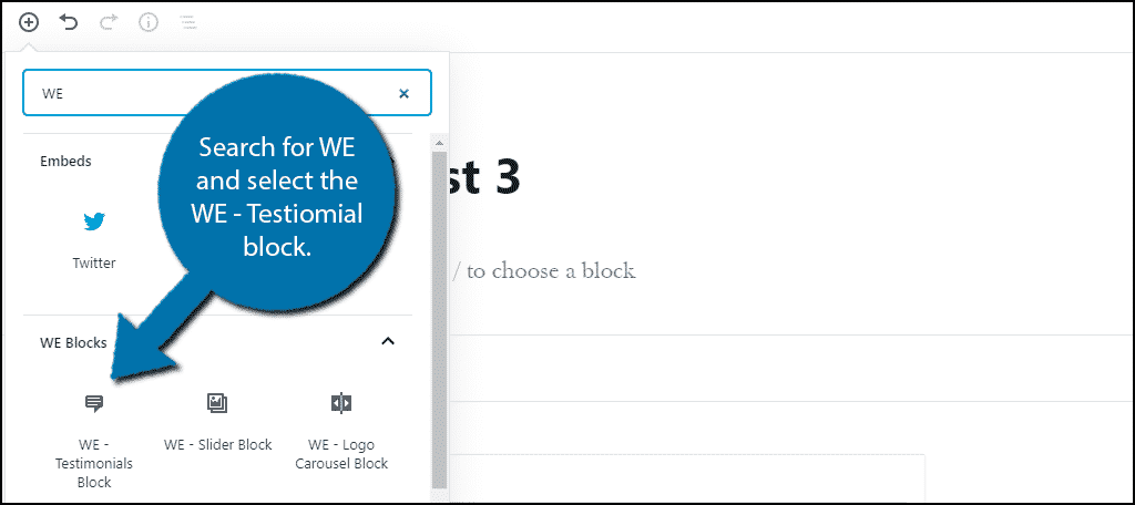 Upon activation, three new blocks will be added to the Gutenberg editor. They include the WE – Testimonials, WE – Slider (for images), and WE – Logo Carousel.