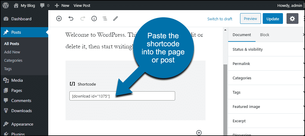 When the download is published, and the page refreshes, you’ll see a shortcode in the right column. Copy the shortcode.