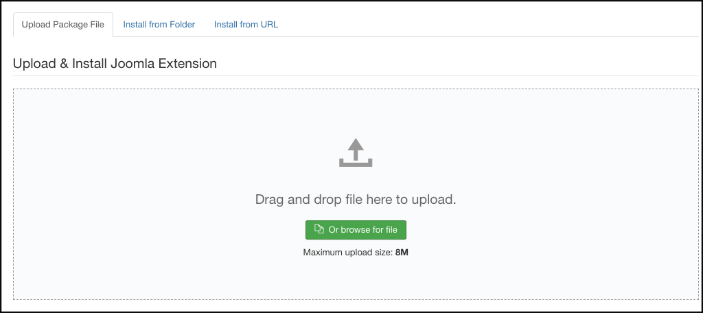 Note: You can also browse for the file and upload it that way if you prefer. Joomla also gives options to install from a folder or from URL, but the process below is easiest.