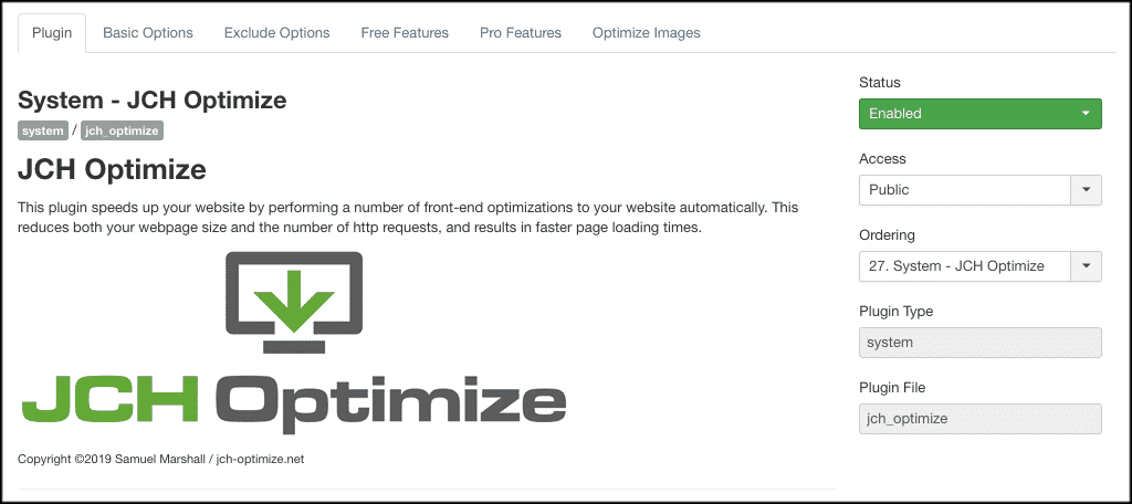 The plugin tab will simply show you all the information regarding the JCH Optimize extension. You can also set your access and ordering settings here. The rest of the plugin information, including troubleshooting and help options, are all displayed.