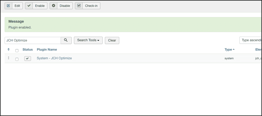 You will see a list of your plugins. Search for the “JCH Optimize” extension you just installed. If it has a red circle with a white “x” in it, click the icon to activate (enable) the plugin.