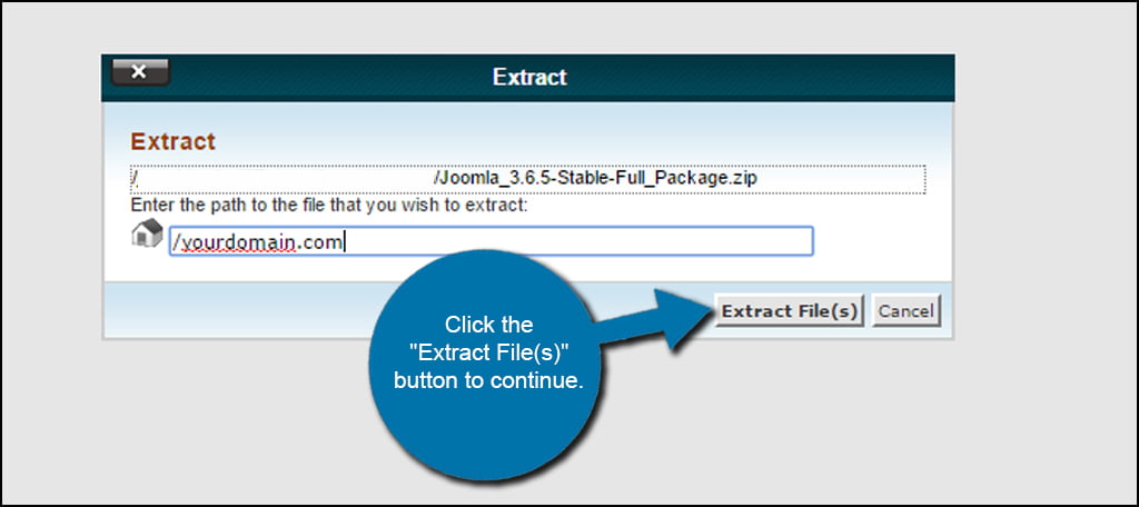 You will need to tell the system what folder in which to extract the files. This path needs to match the file path of the domain you’re working on. Because you uploaded the file directly into the root folder of your website, you can click the “Extract File(s)” button to continue.