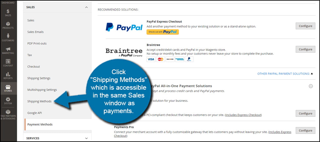 Click “Shipping Methods” which is accessible in the same Sales configuration window as payments.