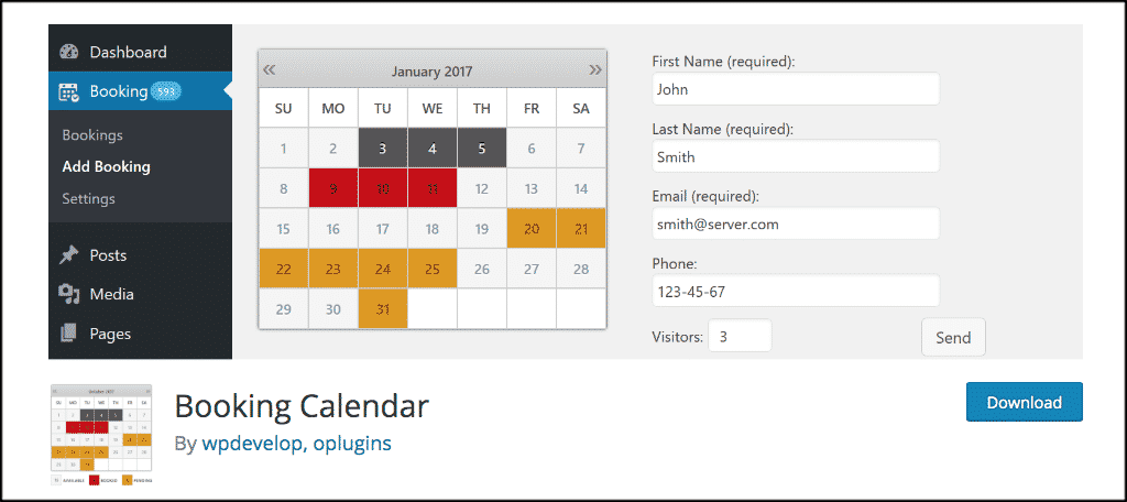 The Booking Calendar plugin enables a simple, yet highly functional, booking system for your website. There is also a pro version that gives you more options, but the free version of this plugin has a ton of features and is perfect for taking bookings for your rooms and properties online. It is also fairly simple to set up.