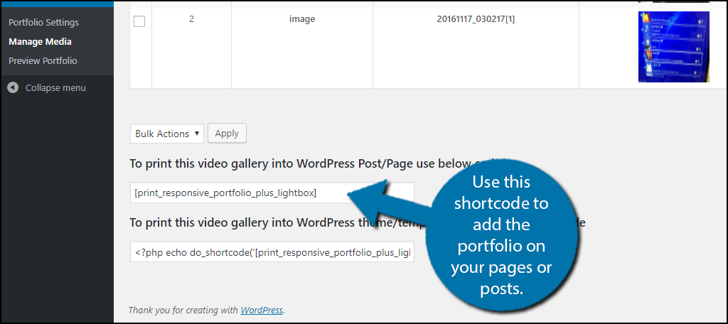 You will now see the portfolio item appear. Repeat these steps and add more videos, images, or links to the portfolio. Once you have added all of the content, take a look at the preview by clicking on the Preview Portfolio option. If you are happy with the result, copy the shortcode and add it to the page or post where you want the portfolio to appear.