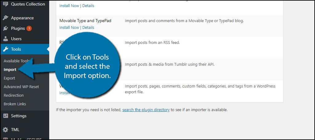 Now that you have all of your exported Squarespace content, it is time to import it into WordPress. WordPress has a very extensive list importing tools for almost every platform.