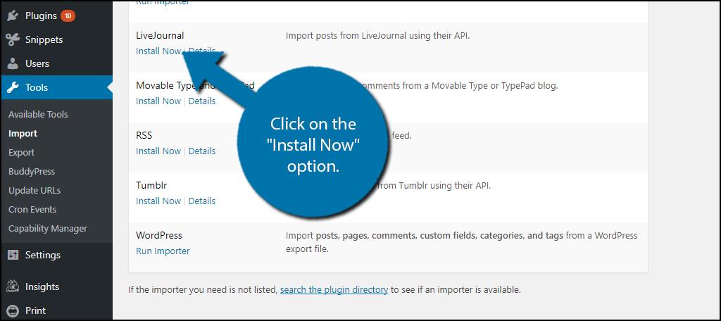 Locate the Livejournal option on the page. Click on the “Install Now” option underneath Livejournal. If you have already installed this, then it will say Run Importer instead.