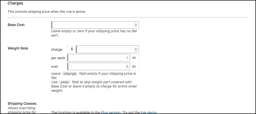 This is where you set your charge rates regarding base cost and weight. You can also add shipping classes here if you happen to be using the pro version of the plugin. Remember, this is a setup of the free version. So skip past that if it doesn’t apply.