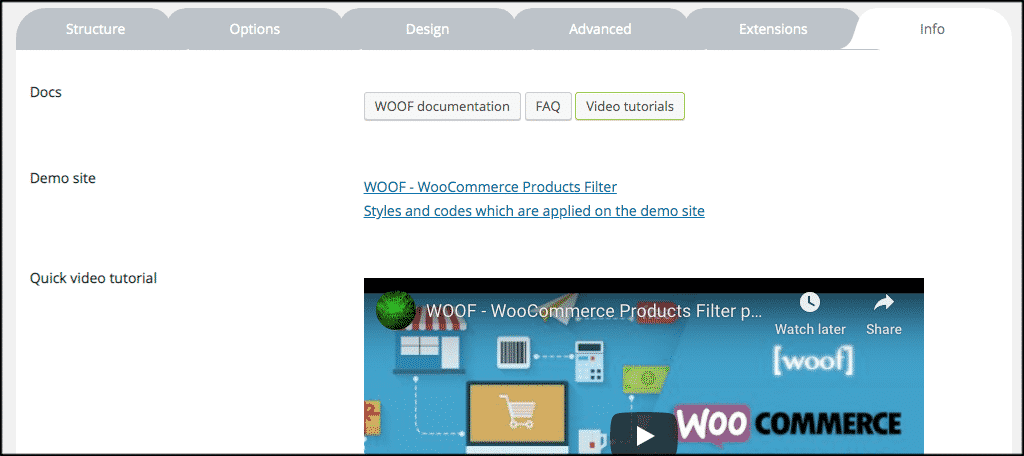 This is where you will set the look and feel of the WOOF plugin. There are several different skins and other design options. Choose those that best fit the design of your website.