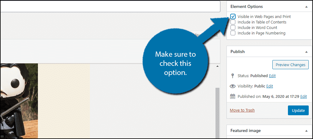 The first option is “Visible in Web Pages and Print” and if this box is not checked, the work will not be visible in your book. Thus, every time you try to edit the book, nothing will appear. You need to check this box.