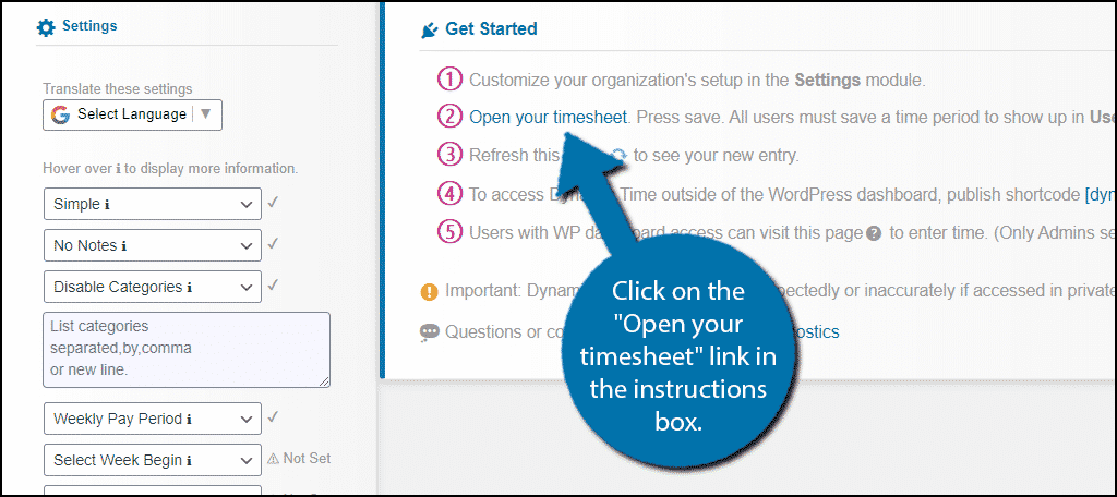Once the information is completely filled out, the plugin will automatically save the information. Click on the “Open your timesheet” link in the instructions box.