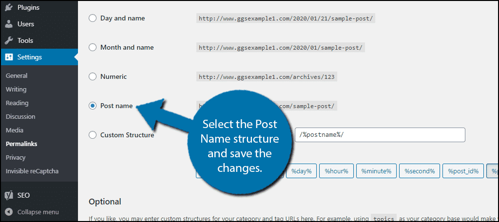 Note: Upon installing the plugin, you may see a warning message depending on your permalink structure. The plugin wants you to use the Post Name structure. Changing your permalink structure may have an impact on your SEO. This won’t be an issue for a brand new website, but it can certainly affect one that’s been around.