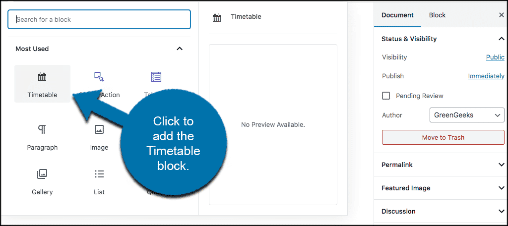 In the dropdown menu that appears, find the “Timetable” block and add it to your page.