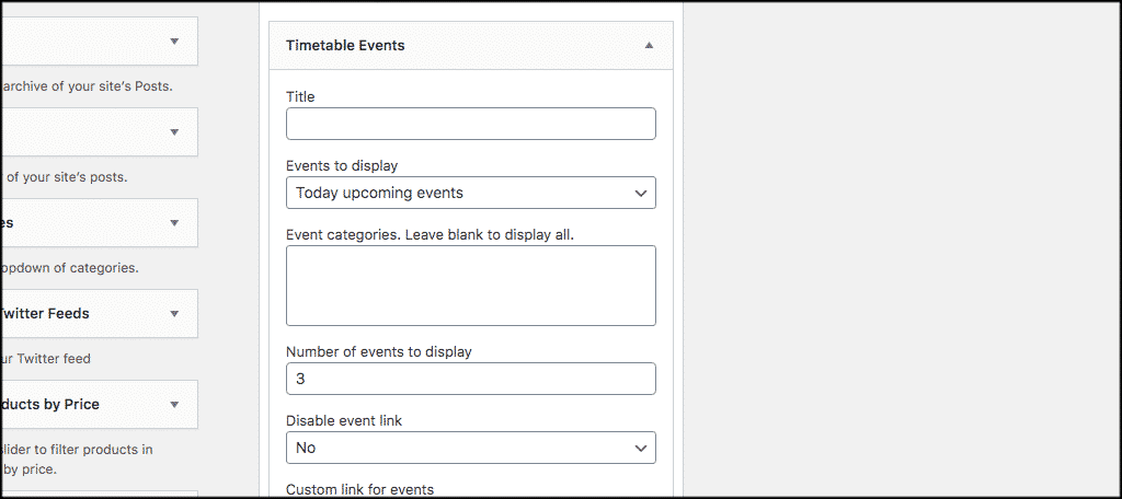 This WordPress timetable plugin also comes with a timetable widget that is automatically added to those available upon activation. To access the widget, click on Appearance > Widgets.
