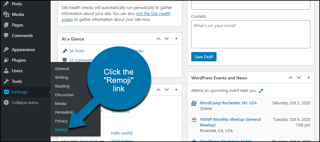 In the left column navigation, mouse over the “Settings” link and click the “Remoji” link.