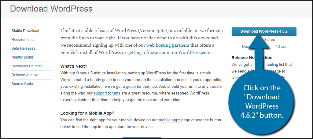 You’re now ready to install WordPress. Go here to download WordPress. Click on the “Download WordPress 4.8.2” button.