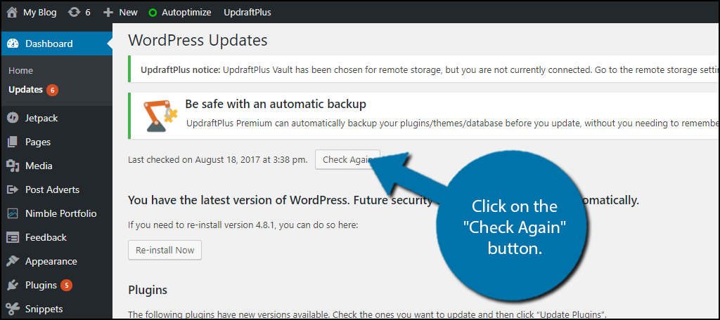 You will see the last time WordPress checked for updates for your plugins and themes. Click on the “Check Again” button to get the most up to date updates whenever you enter this page.
