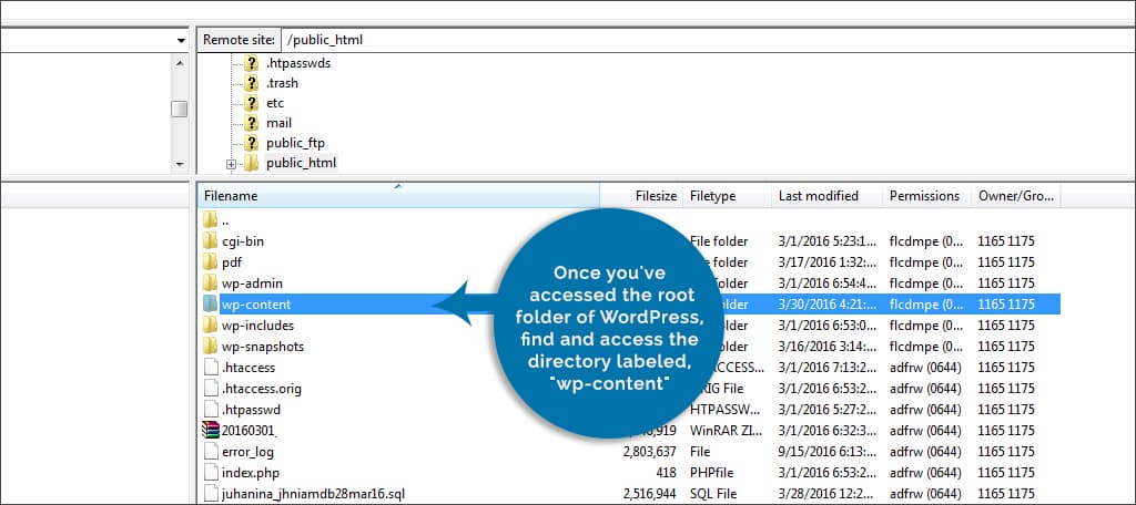 Once you’ve accessed the root folder of WordPress, find and access the directory labeled, “wp-content.”