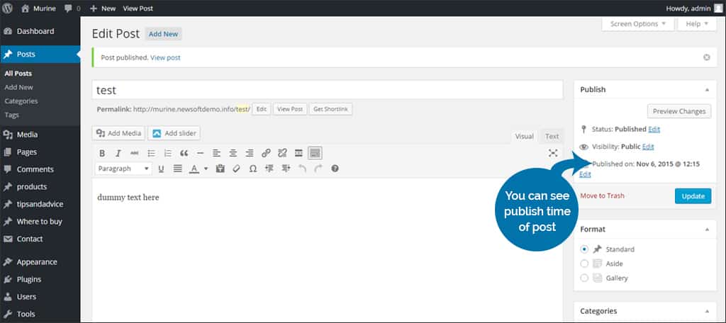The publishing time option in WordPress lets you set the time and date you want the post you are working on to publish. You can adjust the month, day, year and time that this post goes live. If you need to do some writing before you head out on vacation, this is a great way to schedule posts to be released before you leave town.