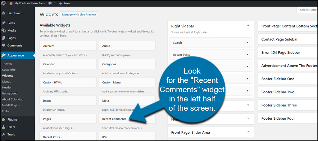 The Widgets area is separated in two halves: widgets and sidebars. Look for the “Recent Comments” widget in the left half of the screen.