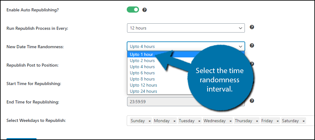 The first option allows you to decide how much time should be between every republish. This is really important because it makes sure you do not flood your website with content. I personally recommend having a few days between republishes, but the choice is yours.