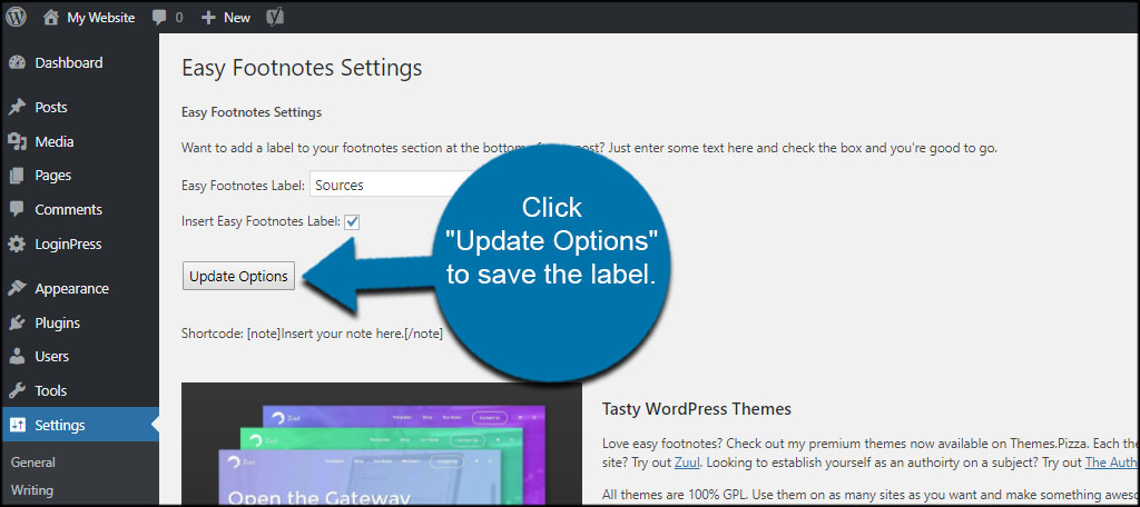 Go back to the settings screen for Easy Footnotes. What if you want a label to accentuate where the footnotes are displayed in content? Perhaps you want to show a list as reference material or sources.